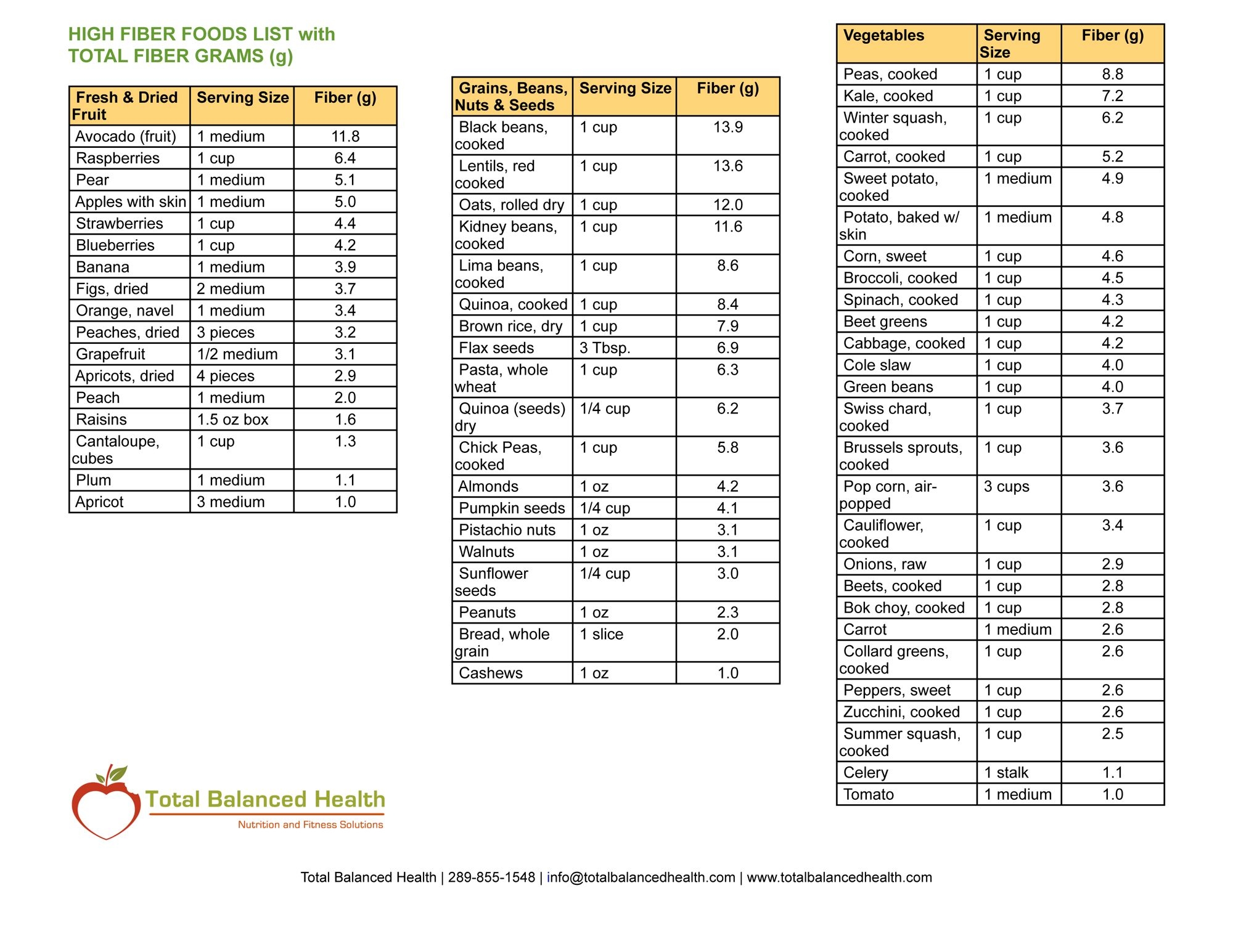 Printable High Fiber Foods Chart